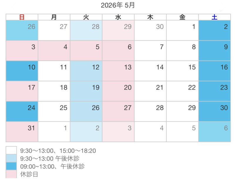 | 午前 | 9:30〜13:00 | 9:30〜13:00 | 休診 | 9:30〜13:00 | 9:30〜13:00 | 9:00〜13:00 | 9:00〜13:00 |