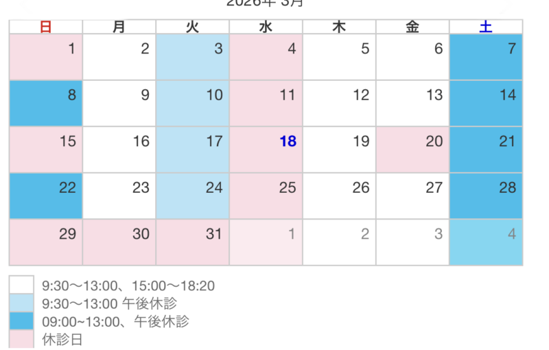 2026年3月の診察日です。3月30日(月曜日)、3月31日(火曜日)臨時休診とさせていただきます。ご迷惑おかけしますが、ご理解のほどよろしくお願いいたします。